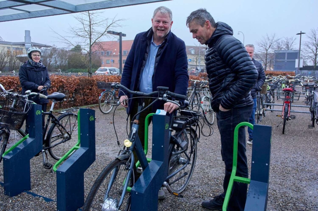Mayor Tomas Breddam has locked his electric bike to the rack using his travel card as the key. He was instructed by Jens Peter Hansen from Bikeep, who supplied the racks. (Photo: Jan Partoft)