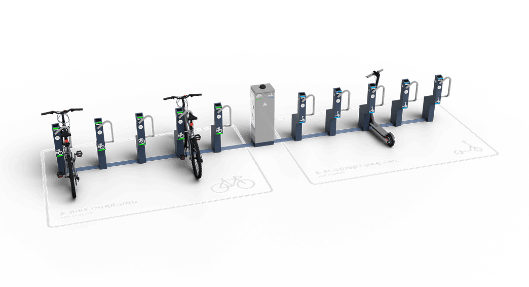 Heavy-duty steel bar locks the frame while the built-in charger tops up your e-bike or e-scooter. Park with confidence for any shift length.