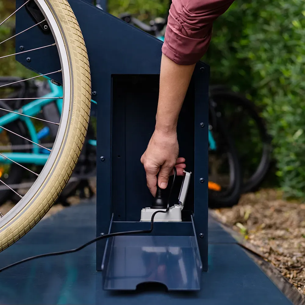 The E-bike Charging Station combines secure locking with integrated e-bike charging. Users bring their own charger, plug it into the dock, and both bike and charger are locked inside — secured while charging.