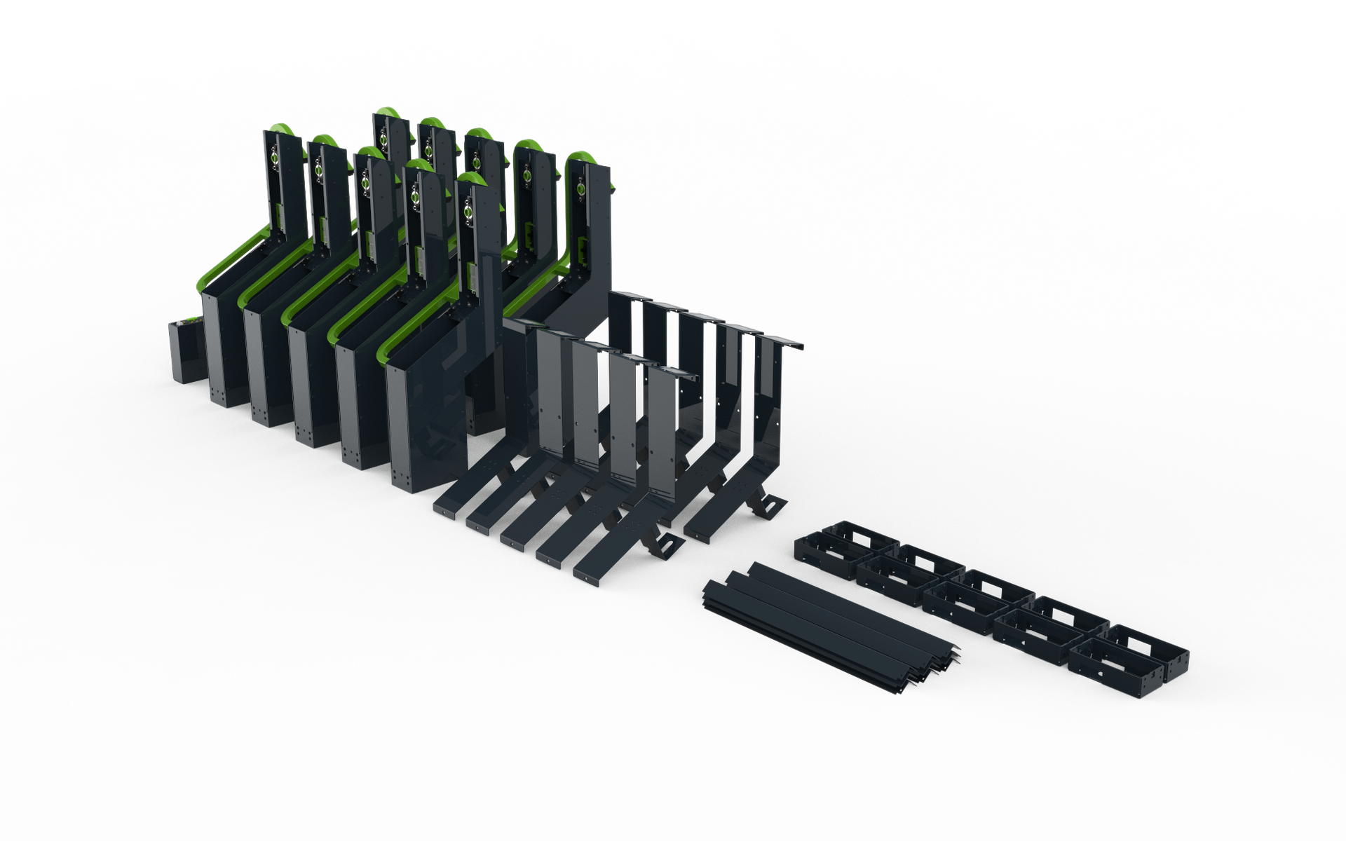 Secure parking with integrated e-bike charging. Users plug in their own charger, close the locking bar, and both bike and charger are secured while charging. Supports all e-bike brands and charger types.
